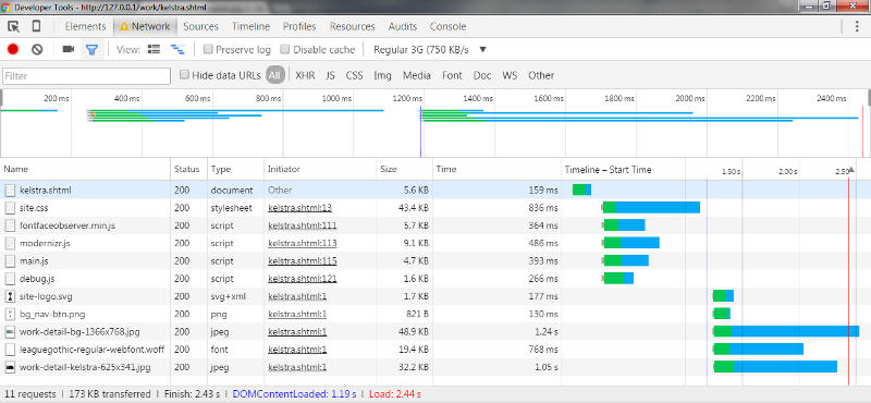 Since this is an offline test, the network bandwidth has been throttled to Regular 3G. This simulates a typical 3G online connection.